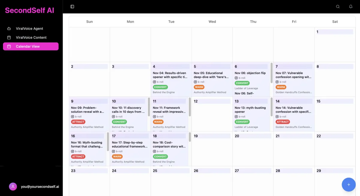 SecondSelf.ai is the first AI-powered content creation platform that delivers viral-ready posts directly to your phone or inbox every day. Unlike other AI tools that require prompting and editing, SecondSelf analyzes real-time trends in your niche, learns your unique voice, and creates complete content packages using our proprietary ARC Content Framework, ensuring every post is designed to convert followers into customers.