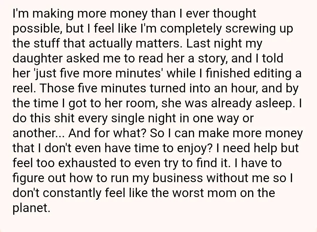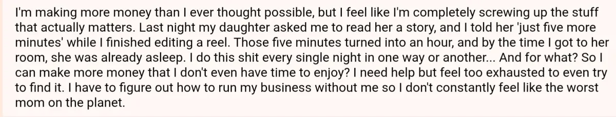 Instead of things "one day" getting better, you've found yourself working double the hours you did in your 9-to-5, except now there's no clocking out, no weekends off, and the guilt of knowing you chose this life.